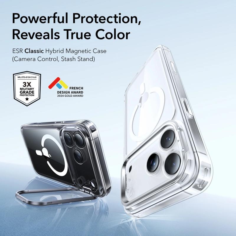 ESR Classic Hybrid Kickstand Case til iPhone 17 Pro kombinerer slank elegance med stærk beskyttelse. Den gennemsigtige hårde bagside fremhæver din iPhone 17 Pro's originale design, mens forstærkede TPU-hjørner giver ekstra holdbarhed mod fald og stød.