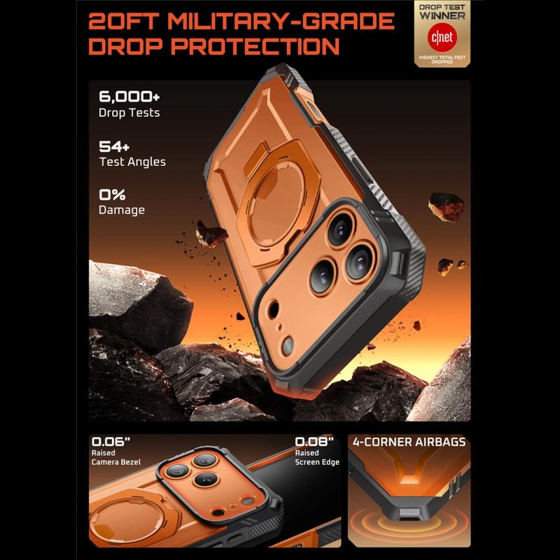 SUPCASE Unicorn Beetle Grip Pro Mag til iPhone 17 Pro Max er udviklet til dem, der kræver holdbarhed og funktionalitet. Den er bygget med slagfast TPU og forstærkede hjørner og lever op til MIL-STD 810G-standarden og beskytter din enhed mod fald på op til 5 meter, samtidig med at den er beskyttet mod ridser og daglig slitage.