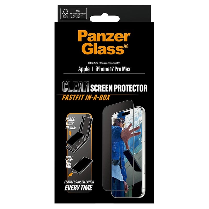 PanzerGlass Ultra-Wide Fit Screen Protector til iPhone 17 Pro Max er designet til hurtig, boblefri installation takket være det innovative FASTFIT IN-A-BOX-system. Du skal blot placere din iPhone 17 Pro Max med forsiden opad, trække i fanen og nyde en perfekt justeret beskyttelse hver gang - intet støv, ingen frustration.