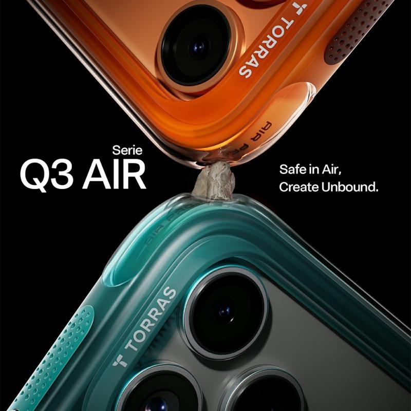 Torras Ostand Q3 Air MagSafe Case til iPhone 17 Pro kombinerer moderne æstetik med avanceret beskyttelse. Det er fremstillet af TPU- og PC-materialer af høj kvalitet og giver en slank, stilfuld profil, samtidig med at det giver et sikkert og behageligt greb.