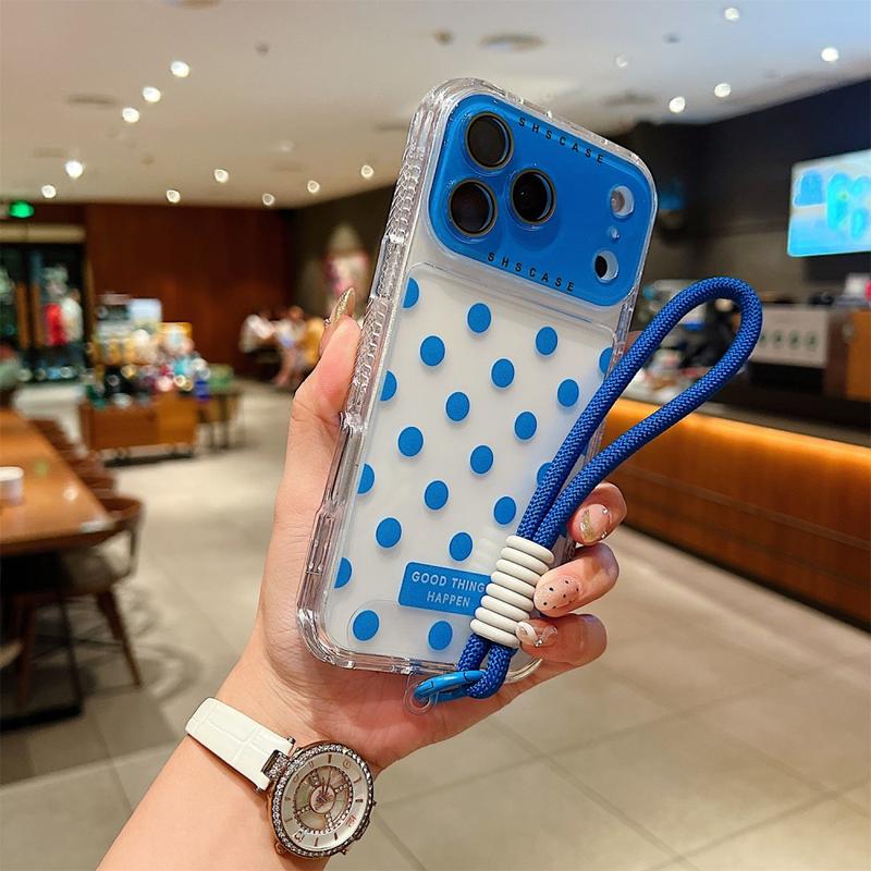iPhone 17 Pro Max PC / TPU Cover med linsefilm og rem - Polka Dot - Blå