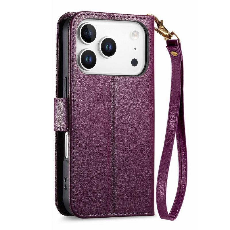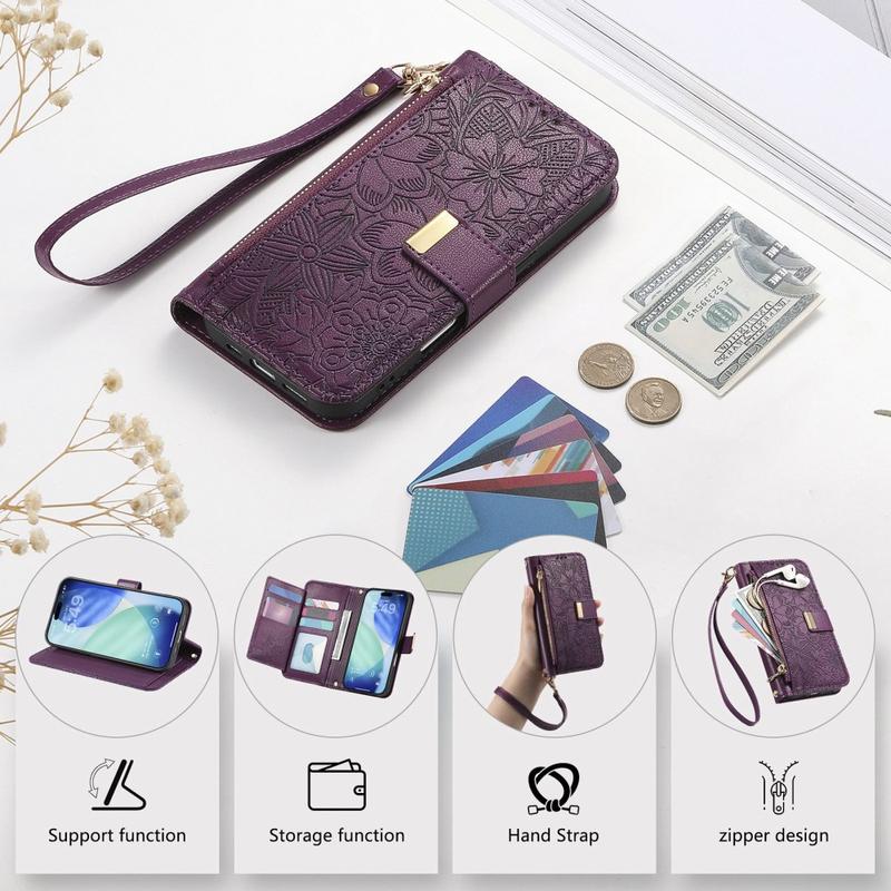 iPhone 17 Pro Pungetui med blomster- og bladmønster med lynlåslomme og håndledsrem - Lilla