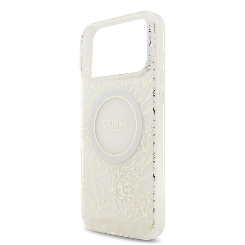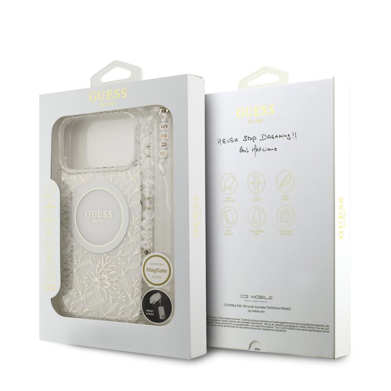 iPhone 17 Pro Max Guess IML Flowers Allover Electro Cover med Perlestrop - MagSafe-kompatibel - Hvid