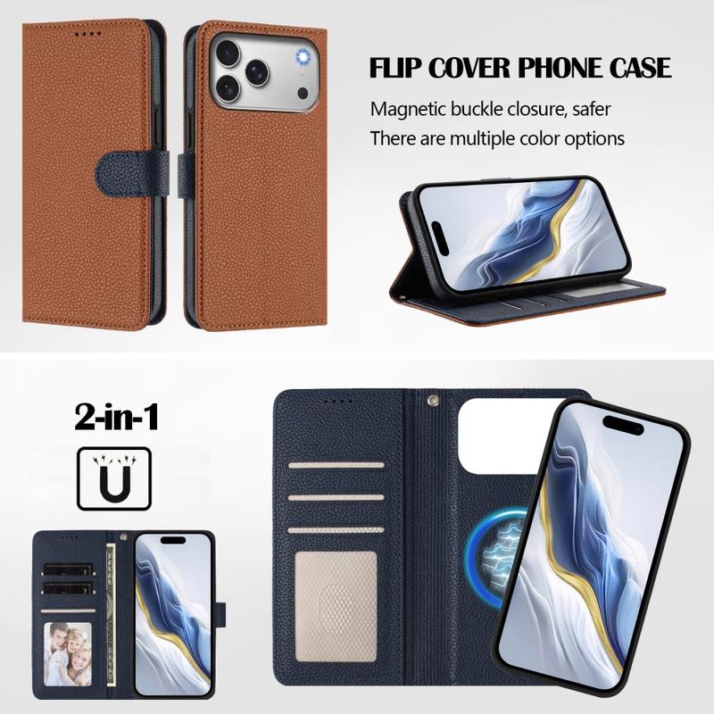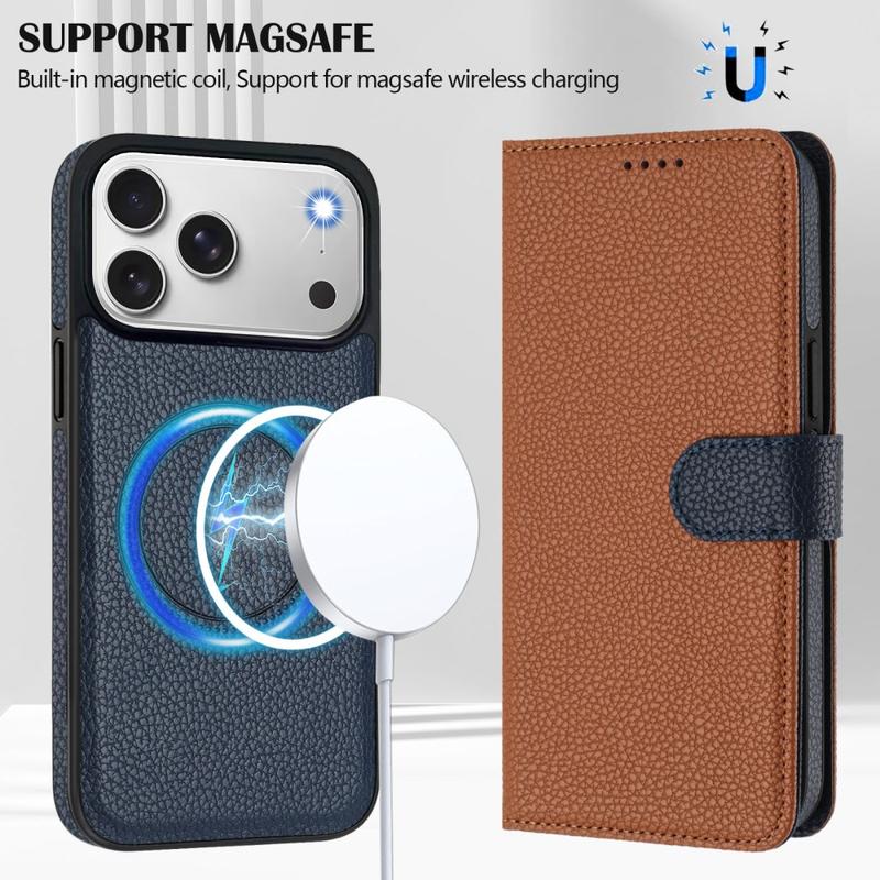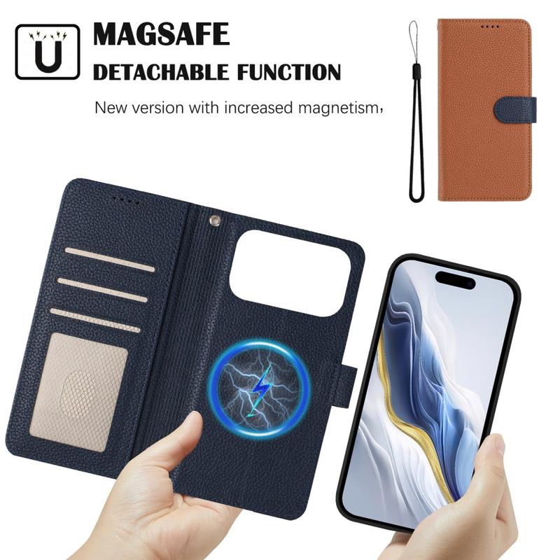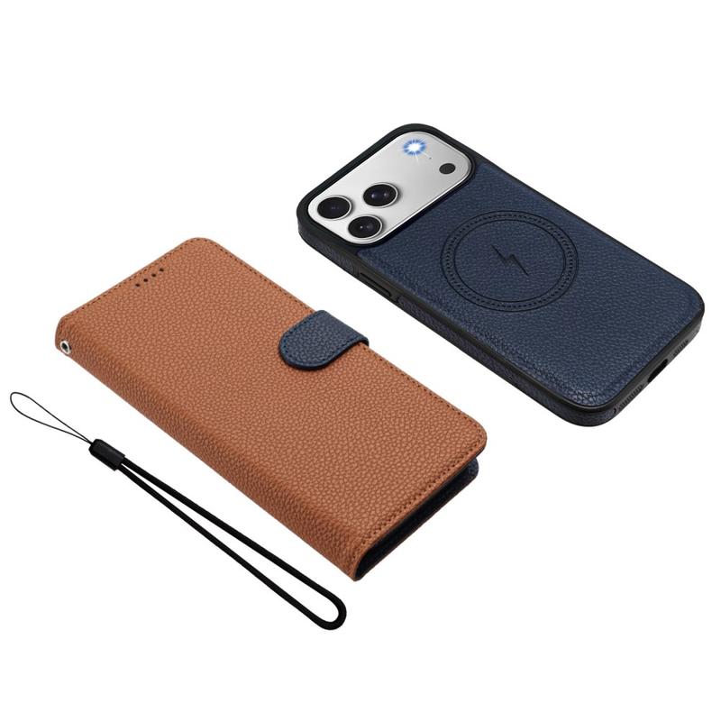 iPhone 17 aftageligt pungetui med MagSafe, RFID-beskyttelse og håndrem - brun / blå