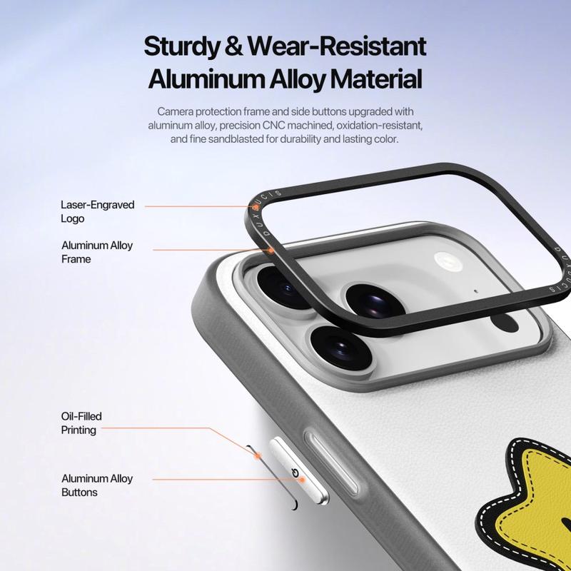Kamerabeskyttelsesrammen og sideknapperne er lavet af aluminiumslegering, præcist CNC-bearbejdet og afsluttet med fin sandblæsning. Det sikrer langvarig farve, holdbarhed og en førsteklasses fornemmelse, forstærket med subtile lasergraverede detaljer.