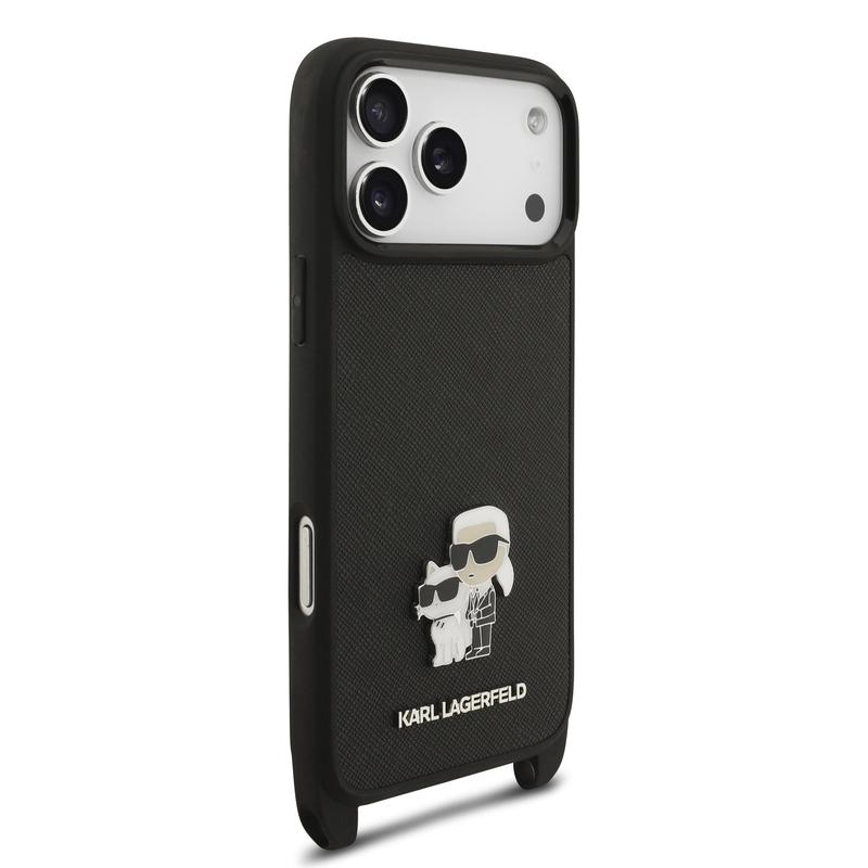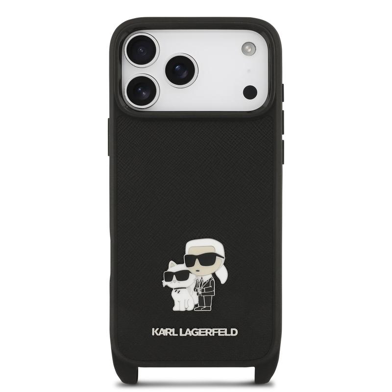 Med iPhone 17 Pro Karl Lagerfeld Saffiano Crossbody Metal Karl & Choupette Cover - Sort, får du et produkt, der er lige så funktionelt som det er stilfuldt. Beskyt din iPhone 17 Pro med dette elegante cover og nyd fordelene ved både sikkerhed og mode.