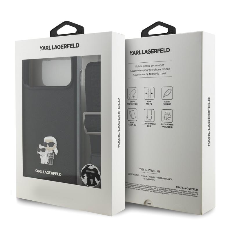 iPhone 17 Pro Karl Lagerfeld Saffiano Crossbody Metal Karl & Choupette Cover - Sort er ikke kun et beskyttende cover, men også et modeudtryk. Det kombinerer funktionalitet og stil på en måde, der gør det til et must-have tilbehør for enhver iPhone 17 Pro ejer. Med sin høje kvalitet og ikoniske design, vil dette cover beskytte din telefon og samtidig tilføje et strejf af luksus til din daglige rutine.