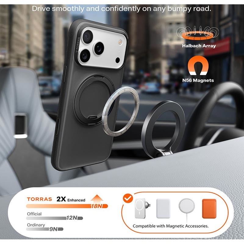 TORRAS O-Fitness Series iPhone 17 Pro Max-etui er en perfekt blanding af beskyttelse, funktionalitet og stil. Den 360° roterende støttefod giver uovertruffen bekvemmelighed til medieforbrug og håndfri brug, mens den forbedrede MagSafe-kompatibilitet sørger for sikker og effektiv opladning. Den militære beskyttelse og det ergonomiske design gør det til et ideelt valg for brugere, der søger både holdbarhed og komfort i et telefonetui.