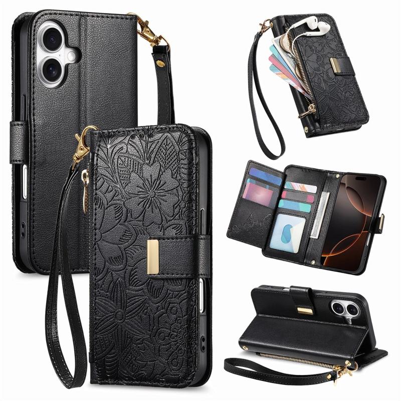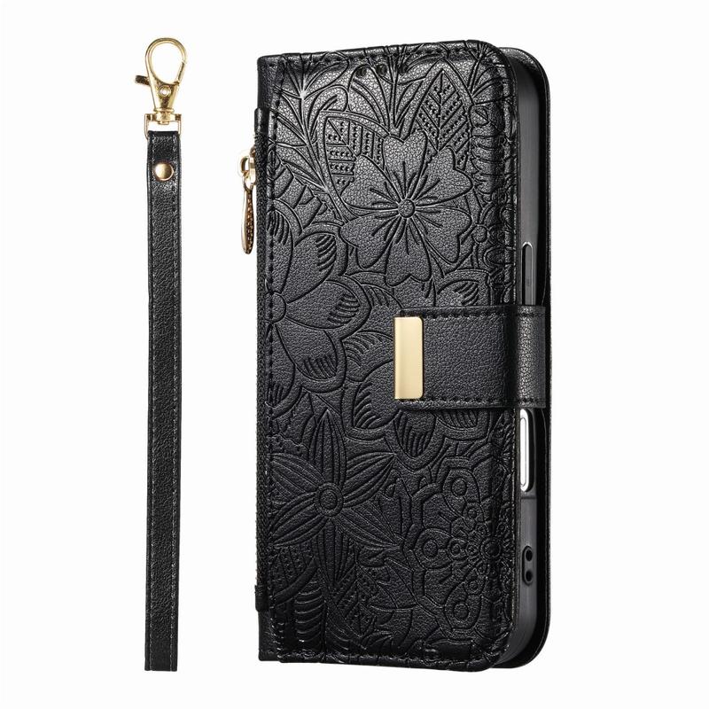 iPhone 17 Pungetui med blomster- og bladmønster med lynlåslomme og håndledsrem - Sort