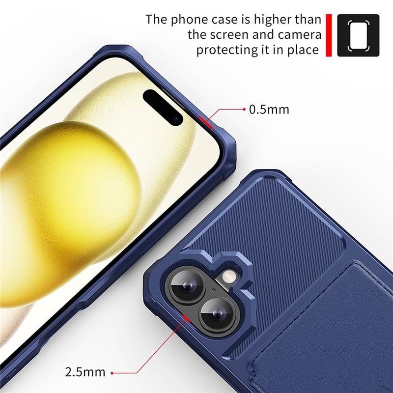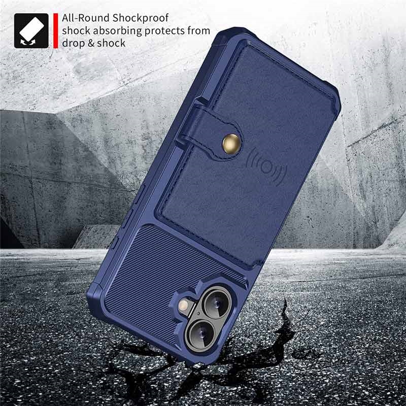- iPhone 17 cover med kortholder har en sikkerheds lukkeknap, pung-design og adskillige kortlommer med en speciel lomme til kontanter