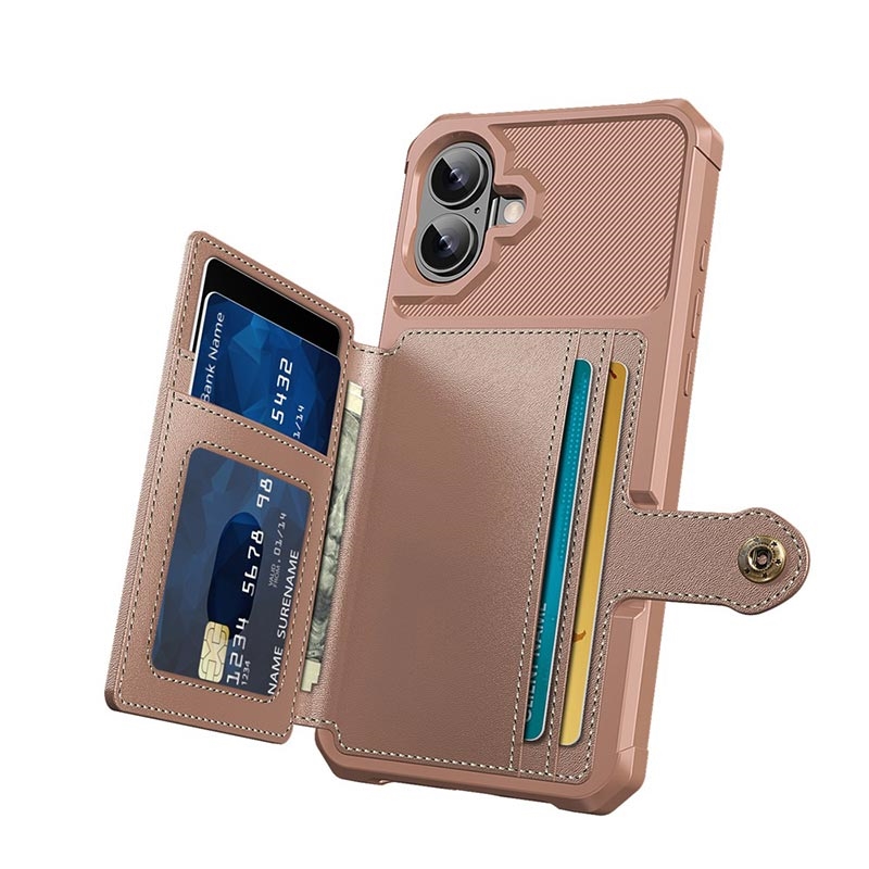 - iPhone 17 cover med kortholder har en sikkerheds lukkeknap, pung-design og adskillige kortlommer med en speciel lomme til kontanter