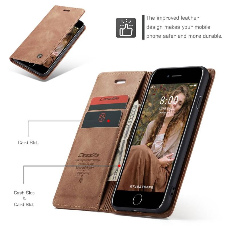 Caseme PU Læder Mobiltelefon Etui med Pung og Stand til iPhone 8/7 4.7 tommer i farven khaki er den perfekte kombination af stil og funktionalitet. Dette etui er designet til at beskytte din iPhone, samtidig med at det tilbyder praktiske funktioner som en pung og en stand. Uanset om du er på farten eller bare ønsker at holde dine ejendele organiseret, er dette etui et fremragende valg.