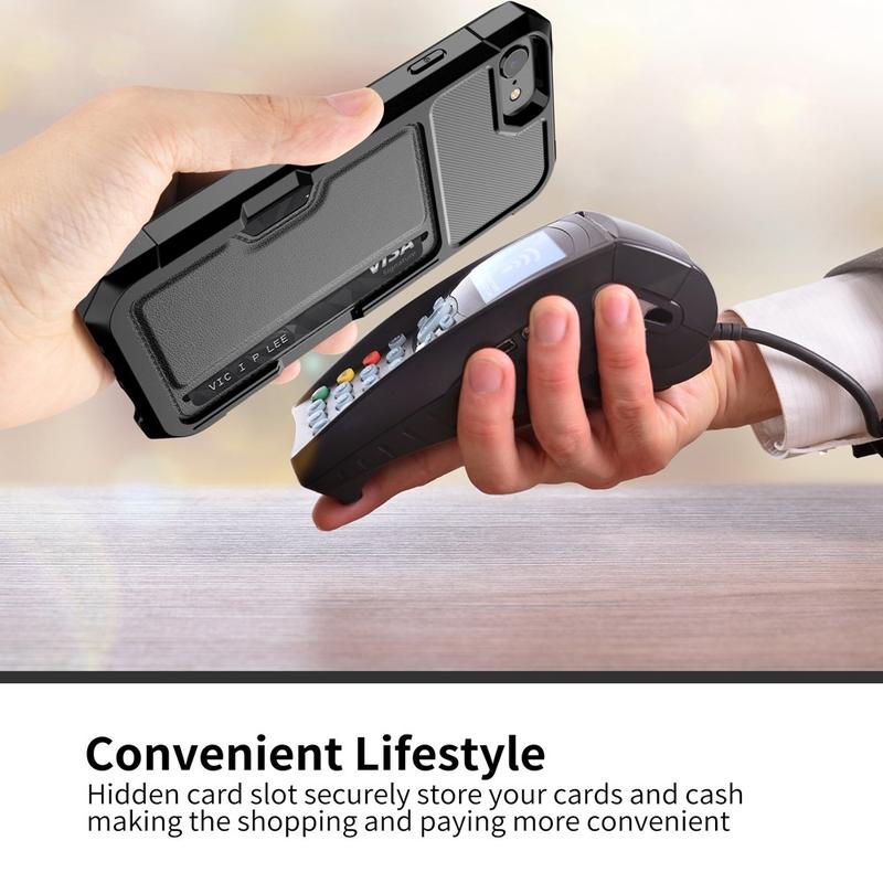 Placer dit kreditkort i holderens baglomme, og brug det som et stativ, takket være den smart designede slot. Du skal ikke bekymre dig om stød og ridser, fordi et TPU-cover med forstærkede kanter vil absorbere dem. En indbygget metalplade gør det muligt at bruge dette kortholder hybride cover med magnetiske holdere. Hævede kanter omkring kameraet og skærmen på din iPhone 7, iPhone 8, iPhone SE (2020), iPhone SE (2022) giver ekstra beskyttelse.