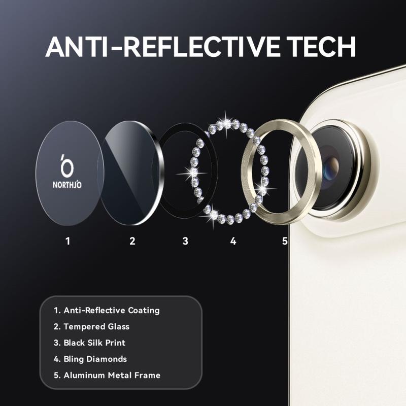NORTHJO Rhinestone Lens Protector tilbyder det bedste fra begge verdener - førsteklasses glitter og høj styrke og holdbarhed. Det forbedrer din telefons udseende, samtidig med at det opretholder professionel fotoklarhed og hverdagsbeskyttelse.