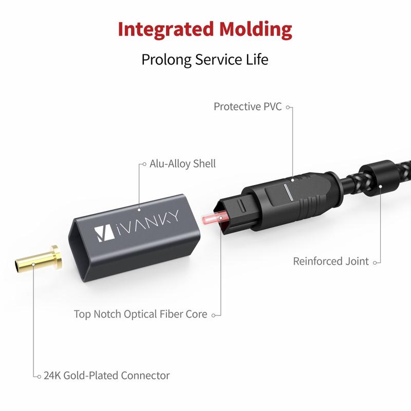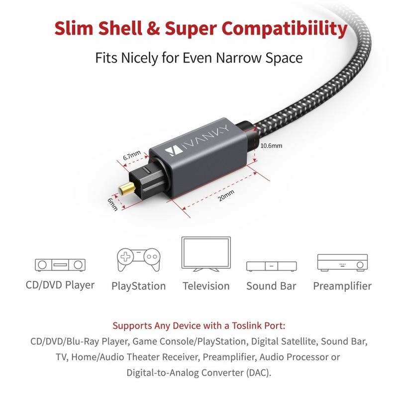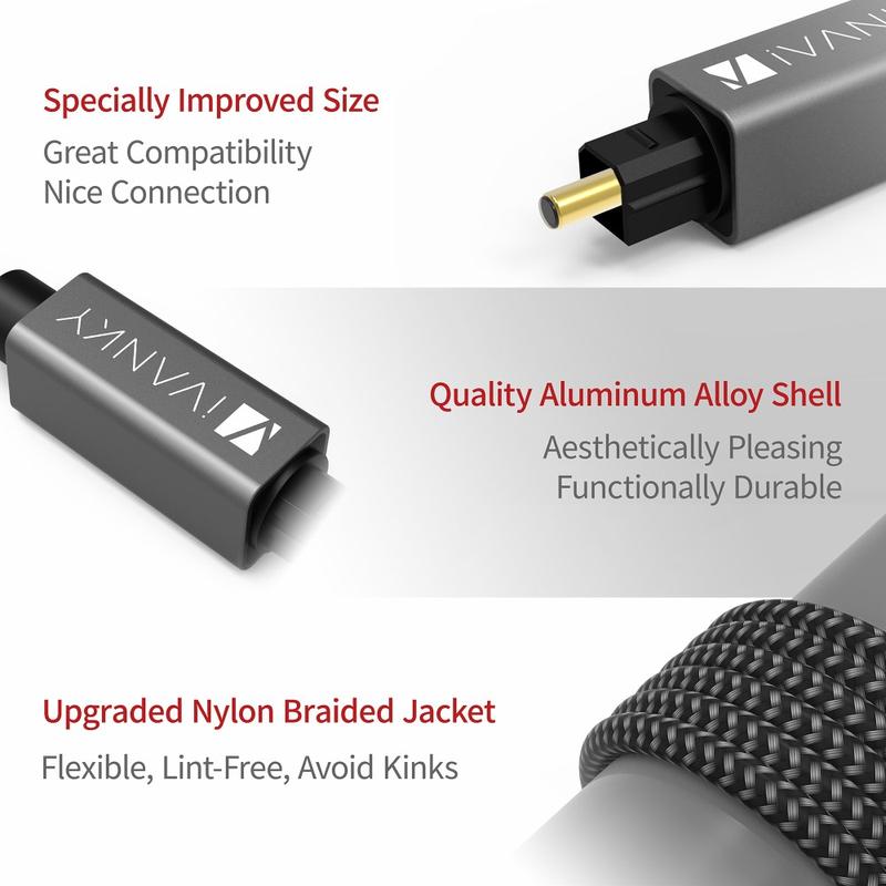 Nyd ren, interferensfri lyd med IVANKY OC03 Toslink optisk lydkabel. Dette 3 m lange fiberoptiske kabel er bygget til pålidelig digital lydtransmission og er ideelt til at forbinde et tv med en soundbar, AV-receiver, hjemmebiografsystem eller spillekonsol. Den slanke stikskal passer fint ind i snævre rum, mens huset af aluminiumslegering giver holdbarhed til daglig brug. En fleksibel flettet nylonkappe hjælper med at forhindre sammenfiltring og knæk, og de medfølgende aftagelige gummihætter beskytter stikkene, når kablet ikke er i brug. Du skal blot sætte stikket i for at få en fast, stabil forbindelse og skarp digital lyd.