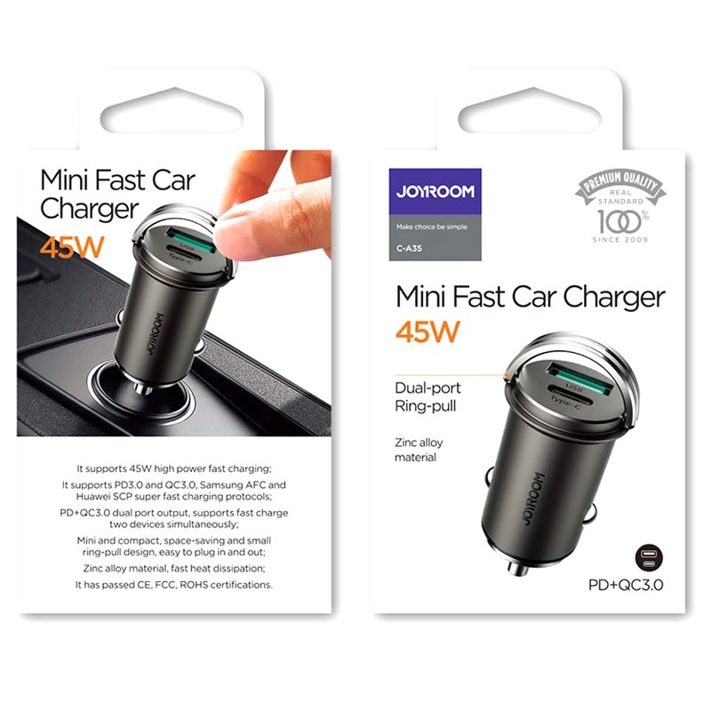 Denne model tilføjer en Type-A og Type-C opladerport til bilens interiør. Begge porte understøtter hurtige opladningsprotokoller! Joyroom C-A35 har en total udgangseffekt på 45W, hvilket sikrer en effektiv præstation.