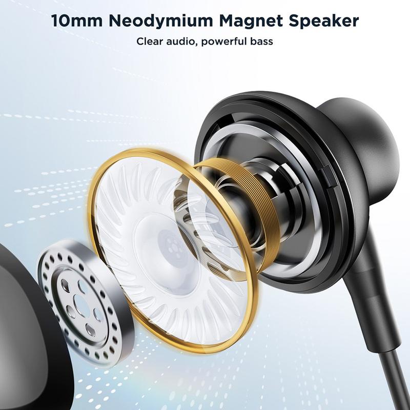 Joyroom JR-EC07 Metal Half-In-Ear Wired Earphones med Type-C-forbindelse kombinerer stil, komfort og funktionalitet, hvilket gør dem til det perfekte tilbehør til dem, der ønsker pålidelig lyd i høj kvalitet i et slankt design.