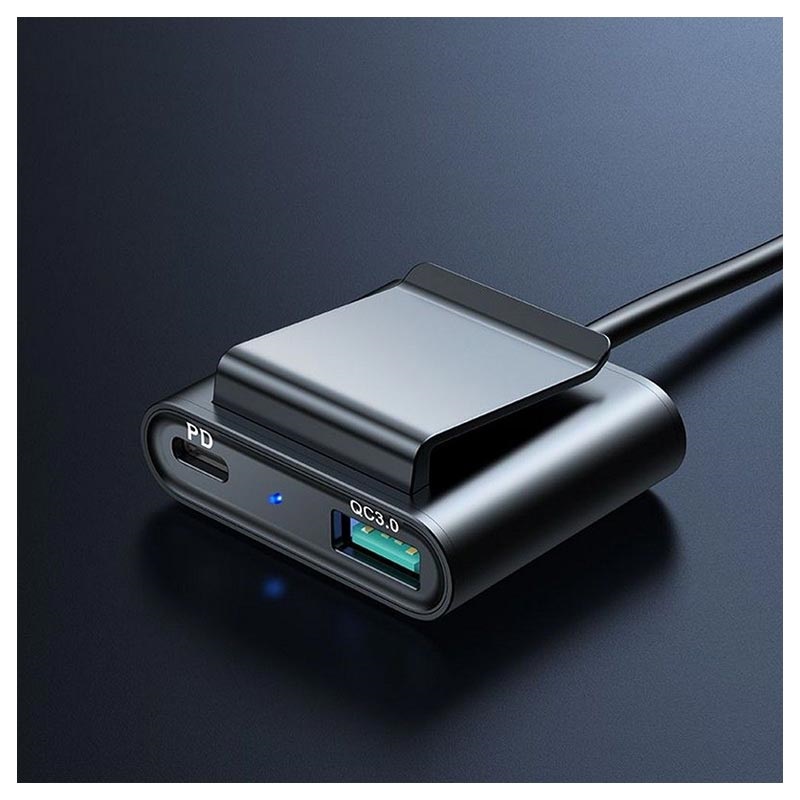 Denne Joyroom JR-CL05 billader har to USB-A og en USB-C port på den primære enhed, samt et indbygget 1,5 meters forlængerkabel med en USB-C og USB-A port. Den er udstyret med Power Delivery og Qualcomm Quick Charge 3.0 teknologierne, så du kan give dine enheder en hurtig opladning. Dette forlængerkabel har en klips på bagsiden, så du kan organisere det ordentligt. Takket være 5 kraftfulde outputs og dine kabler, kan du genoplade op til fem enheder samtidig.