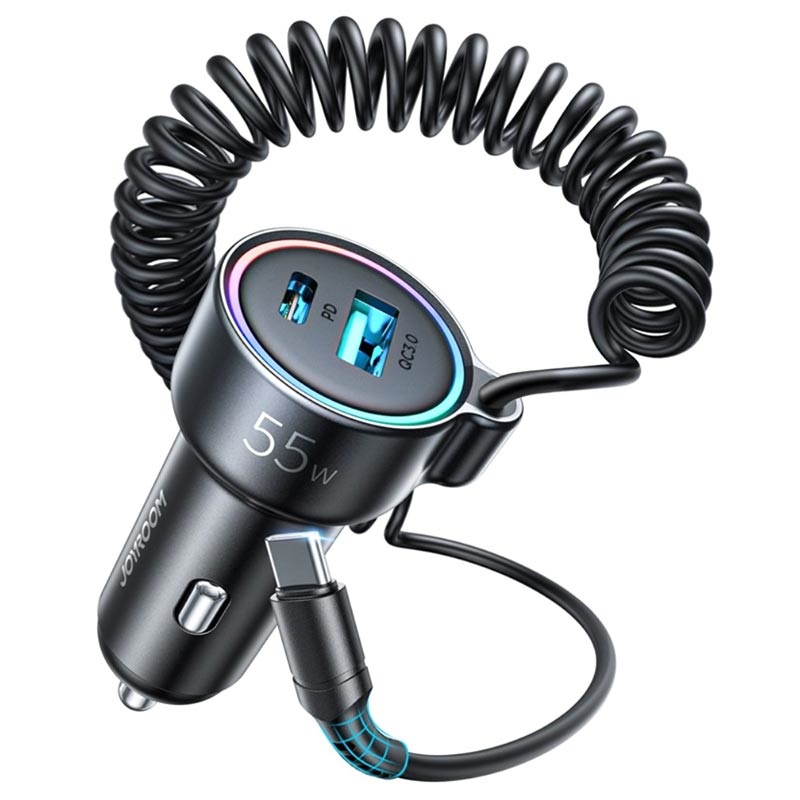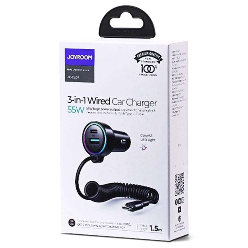 Joyroom JR-CL07 3-i-1 Kabel Hurtig Biloplader 55W - 1xUSB, 1xUSB-C, QC3.0, PD, PPS, AFC, FCP