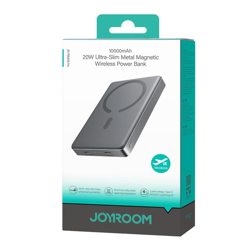 JOYROOM JR-PBM08Pro er en elegant, ultratynd magnetisk powerbank, der er bygget til hurtig, sikker og praktisk hverdagsopladning. Med et stærkt magnetisk greb, automatisk trådløs opladning og 20W PD-hurtigopladning leverer den pålidelig strøm på farten. Skallen af aluminiumslegering forbedrer varmeafledningen, mens den kompakte profil på 14 mm gør den nem at have med i en lomme eller taske.
