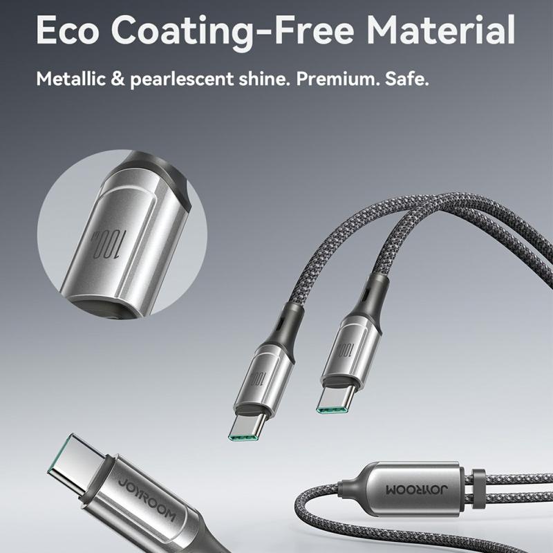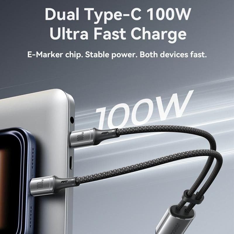 Oplad to USB-C-enheder på samme tid med JOYROOM S-A57 USB-C til dobbelt USB-C-kabel. Det er bygget til moderne bærbare computere, tablets og smartphones, understøtter op til 100 W hurtig opladning og bruger en E-Marker smart management chip til at hjælpe med at levere stabil strøm til kompatible enheder. Du får også 480 Mbps dataoverførsel til daglig synkronisering, så ét kabel dækker både opladning og filoverførsel. Den holdbare 48-strengede nylonflettede konstruktion er designet til at modstå slid og daglig bøjning, mens den medfølgende kabelorganisator holder din opsætning pæn på dit skrivebord eller i en taske. Med testede holdbarhedsegenskaber som 10.000+ indsættelser og en belastningskapacitet på 7 kg er det skabt til hyppig brug.