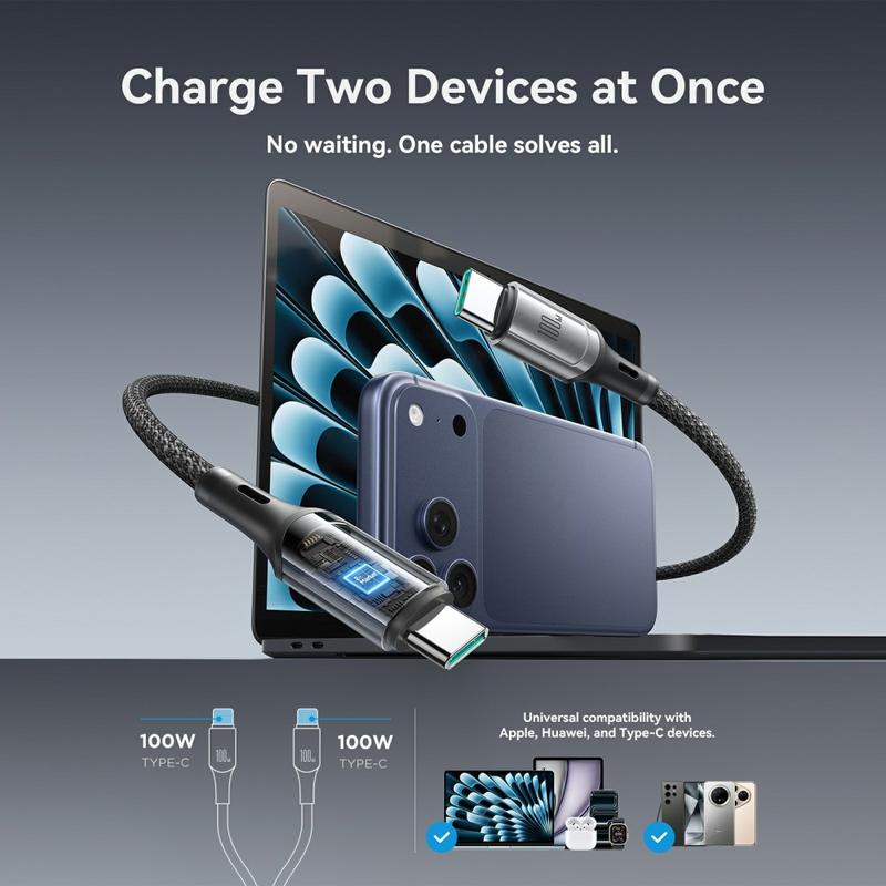 Hvis du bruger flere USB-C-enheder, reducerer dette kabel rodet og gør opladningen enklere. Du får højeffektiv 100W-understøttelse, smart strømstyring og en robust flettet konstruktion, der er designet til ægte daglig brug - plus det praktiske organiseringsbånd til nem opbevaring.