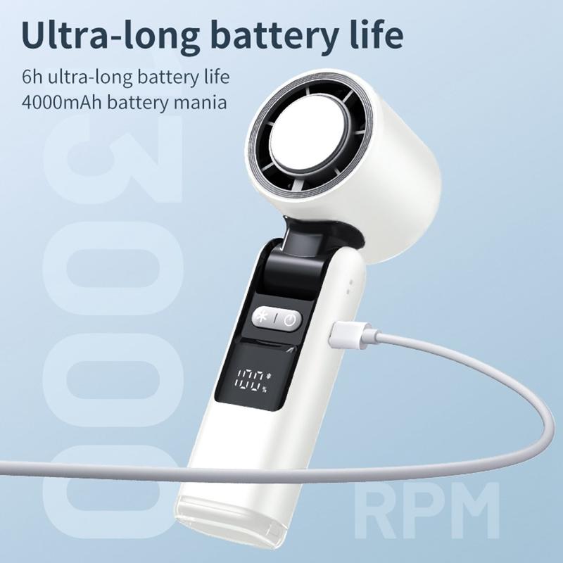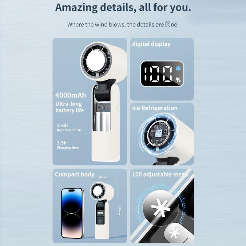 K-801 Håndholdt ventilator med koldkomprimering - bærbar køler med 100 hastigheder, digitalt batteridisplay og halvleder-is-teknologi, USB-C genopladelig