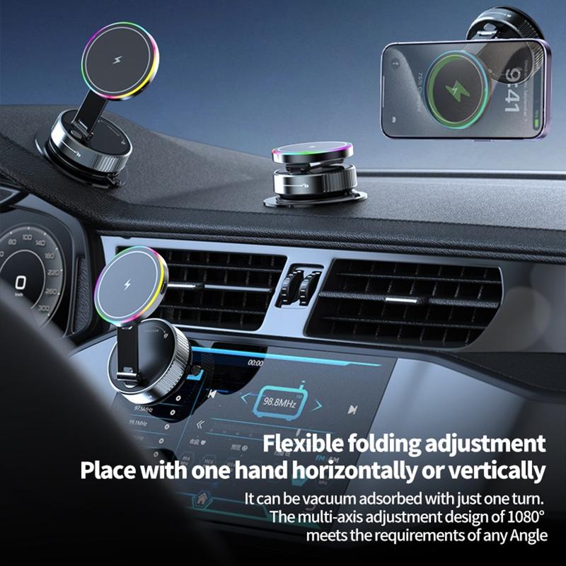 K3 Roterende magnetisk bilholder - 15W trådløs opladning, N52-magneter, LED-lys, 360° justerbar, vakuumsugerbase til bil og skrivebord