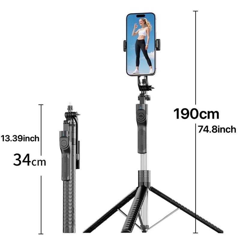 - Udtrækkeligt 1,9M-stativ - Kan udvides til 190 cm til brede optagelser eller gruppebilleder; kan foldes sammen til 34 cm, så det er let at bære.