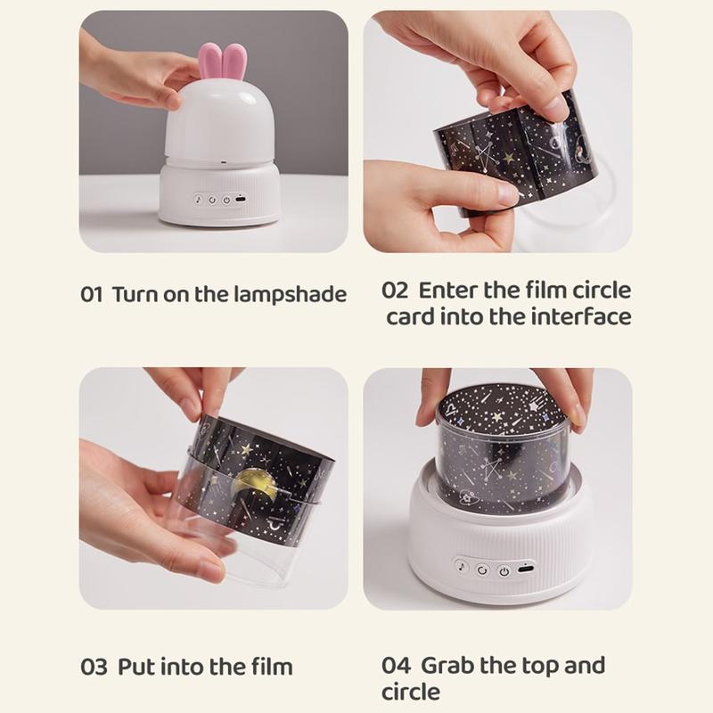 Rabbit Projection Lamp kombinerer beroligende lys, blid musik og et sjovt design, hvilket gør den til en vidunderlig tilføjelse til ethvert børneværelse. Fjernbetjeningen og USB-strømkilden er praktiske, og CE- og RoHS-certificeringerne sikrer, at den er sikker at bruge for hele familien.