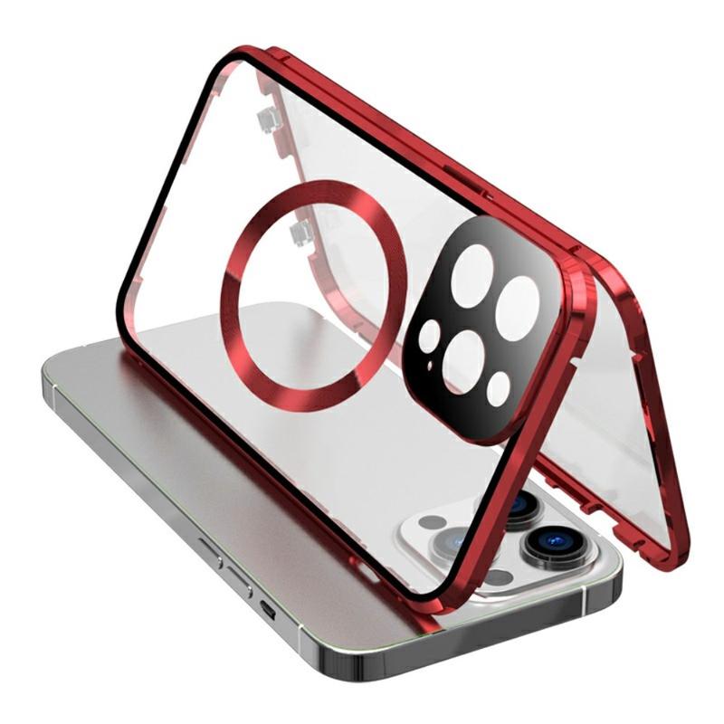 Kompatibel med MagSafe-etui til iPhone 15 Pro magnetisk metalramme + dobbeltsidet telefoncover i hærdet glas med spændelås - rød