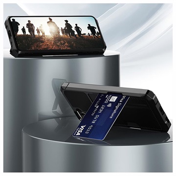 Placer dit kreditkort i holderens baglomme, og brug det som et stativ, takket være den smart designede slot. Du skal ikke bekymre dig om stød og ridser, fordi et TPU-cover med forstærkede kanter vil absorbere dem. En indbygget metalplade gør det muligt at bruge dette kortholder hybride cover med magnetiske holdere. Hævede kanter omkring kameraet og skærmen på din Samsung Galaxy S21 5G giver ekstra beskyttelse.