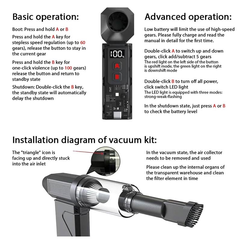 2-i-1 Jet Turbo Blower og støvsuger er et kompakt, højhastigheds rengøringsværktøj designet til hurtig fjernelse af støv og daglig rengøring. Skift mellem kraftig luftblæsning og vakuumsugning for at håndtere forskellige opgaver i dit hjem, din bil eller på din arbejdsplads. Med 100 hastighedsniveauer og et stort 8000 mAh batteri kan du finjustere luftstrømmen eller sugekraften og fortsætte i lange perioder, når det er nødvendigt.