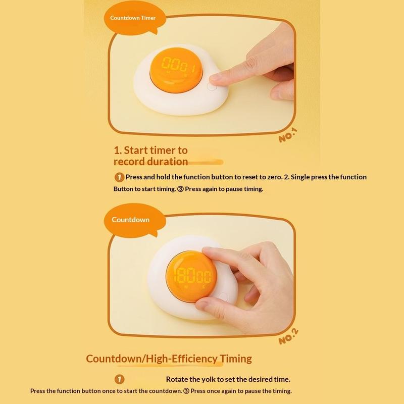 - Countdown-tilstand: Drej æggeblommen for at indstille den ønskede tid, tryk én gang på funktionsknappen for at starte, tryk igen for at pause