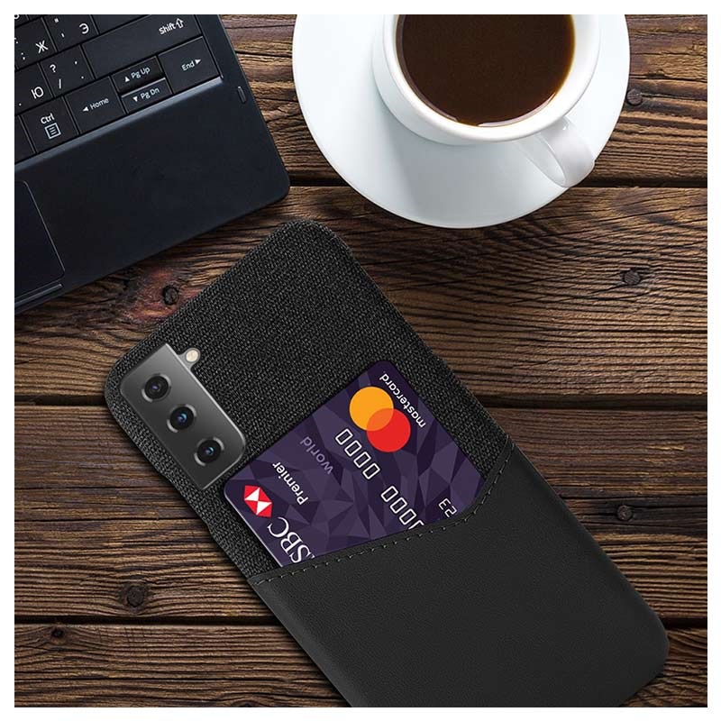 Takket være det hårde polykarbonatlag giver dette utroligt tynde cover din Samsung Galaxy S21+ 5G ekstra fasthed samtidig med at enheden stadig kan ligge i din lomme. Derudover gør det delikate lag stof og den integrerede kortlomme tilbehøret både moderigtigt og praktisk.