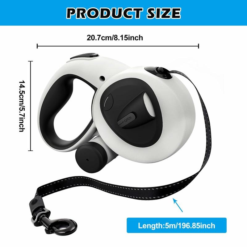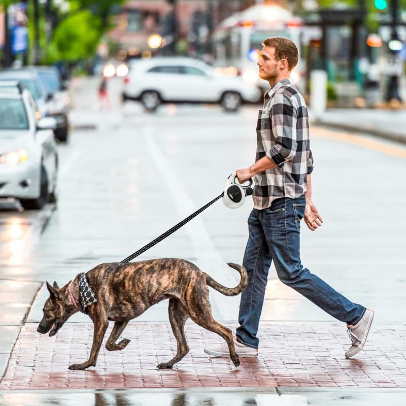 Giv hver gåtur mere frihed, sikkerhed og stil. Denne 5meter lange udtrækkelige snor har en lysstærk USB-opladelig LED-lommelygte, reflekterende bånd med høj synlighed og et silkeblødt bremsesystem med én knap, der styrer selv de største racer (op til 50kg). Et ergonomisk, skridsikkert håndtag holder dig komfortabel på lange gåture, mens den integrerede affaldsposedispenser betyder, at du altid er forberedt.