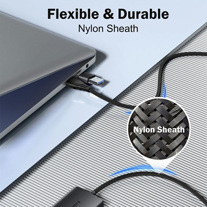 Adapteren har et nylonflettet kabel, der modstår sammenfiltring og træk, hvilket forbedrer holdbarheden over tid. Det kompakte adapterhus og kabellængden på 60 cm gør den nem at have med i en computertaske eller rygsæk.