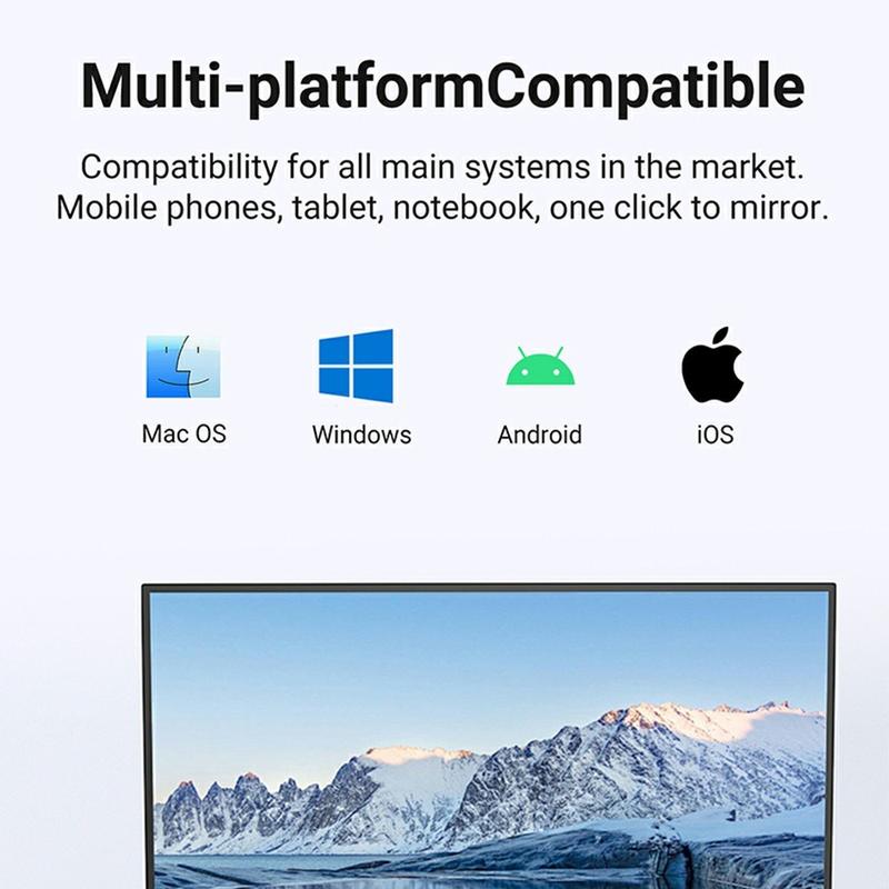 P1000 er kompatibel med Android, iOS, Windows og macOS og understøtter Miracast- og P2P-teknologier. Dette giver mulighed for problemfri skærmspejling på tværs af flere enheder, hvilket gør den velegnet til både personlig og professionel brug.