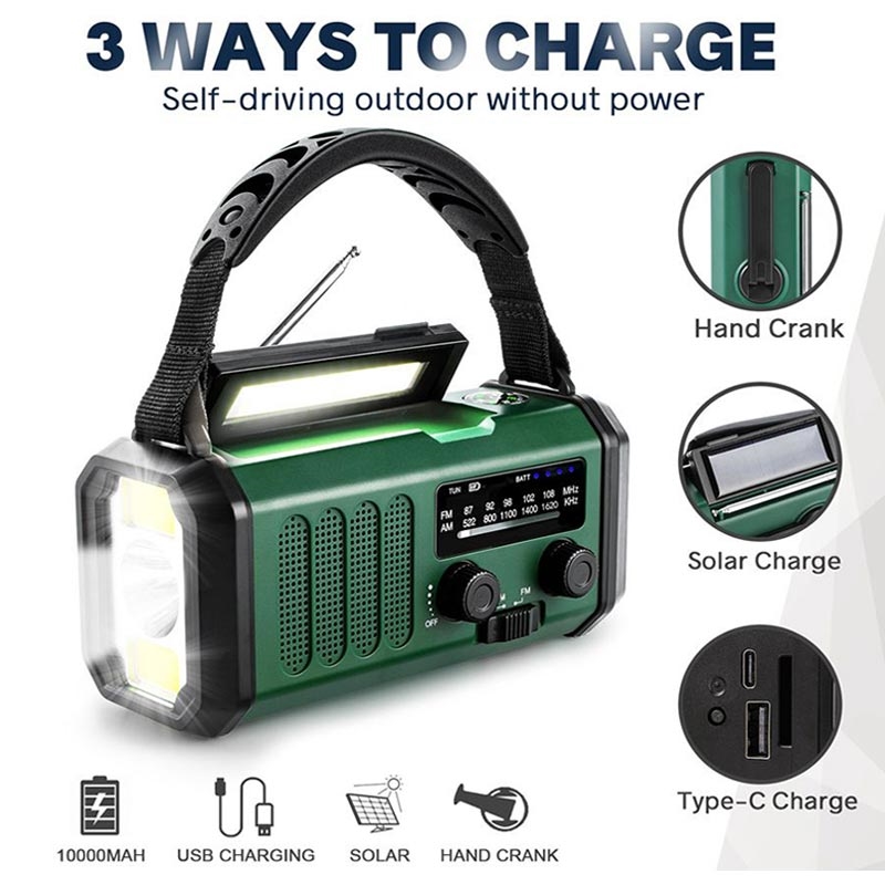 Lippa FM-nødradio med håndsving, solpanel, kompas og 10000mAh powerbank