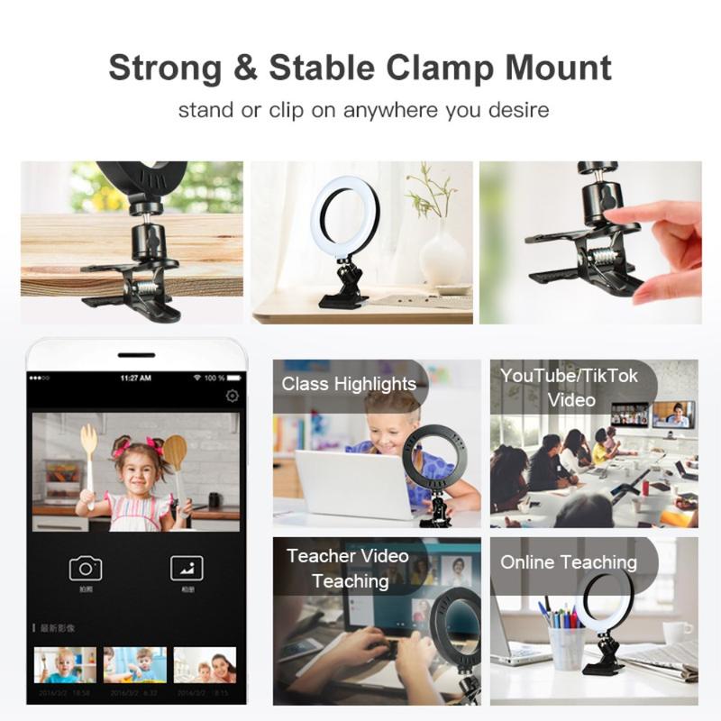 6" ringlys til skrivebordet med 3 farvetilstande og justerbar lysstyrke. Leveres med en stærk klemme