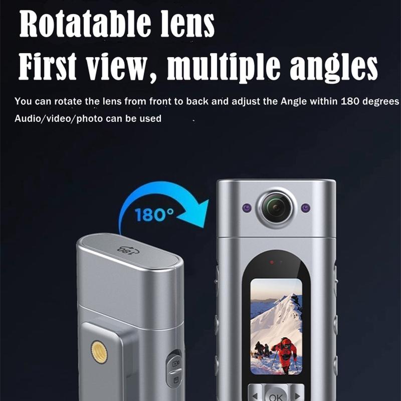 - 180 ° drejelig linse - Drej en gang for landskab, igen for portræt; perfekt til cykelstyr, hjelmsider eller body-cam-orientering.