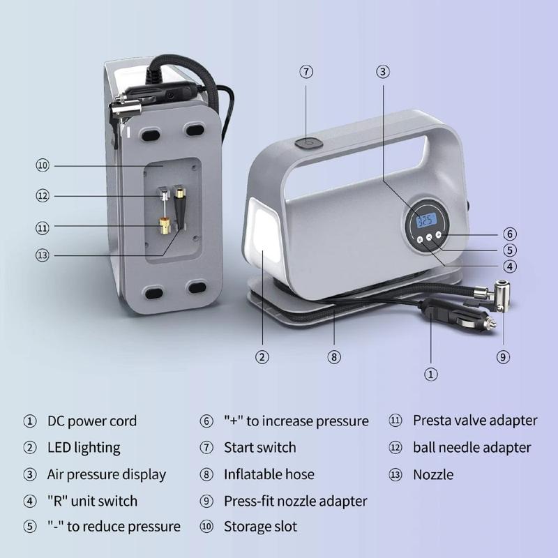 Vær klar til enhver situation med 22 Cylinder Digital Display Car Air Pump - din alt-i-en-løsning til præcis, bærbar dæktrykspumpning.