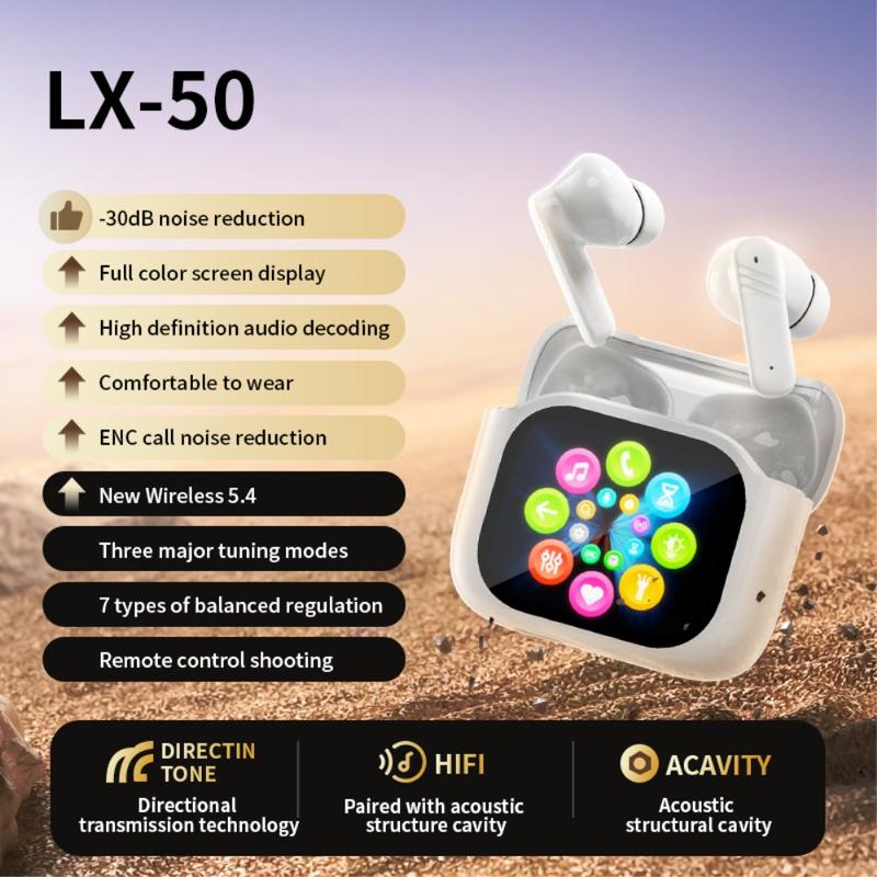 De trådløse LX-50-ørepropper kombinerer smart kontrol, effektiv støjreduktion og omsluttende lyd i et moderne in-ear-design. Den mest iøjnefaldende funktion er HD-berøringsskærmen i fuld farve, der er indbygget i opladningsetuiet, så du kan styre indstillinger, tilstande og funktioner direkte - uden brug af telefon. Med dobbelt støjreduktion, stabil Bluetooth 5.4-forbindelse og en behagelig ergonomisk pasform er LX-50-ørepropperne designet til hverdagslytning, opkald og bekvemmelighed på farten.