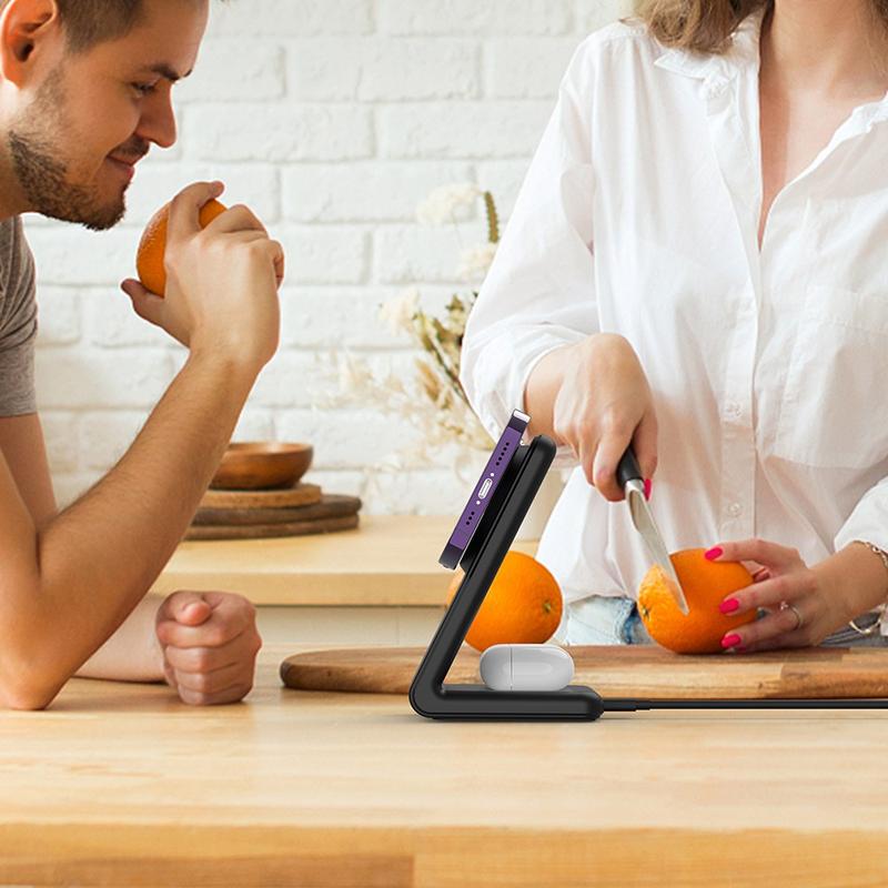 Oplad din iPhone og dine AirPods samtidig uden at skulle rode med flere kabler. De indbyggede magneter sikrer et perfekt klik og et stabilt greb, hvilket garanterer effektiv og sikker opladning hver gang.