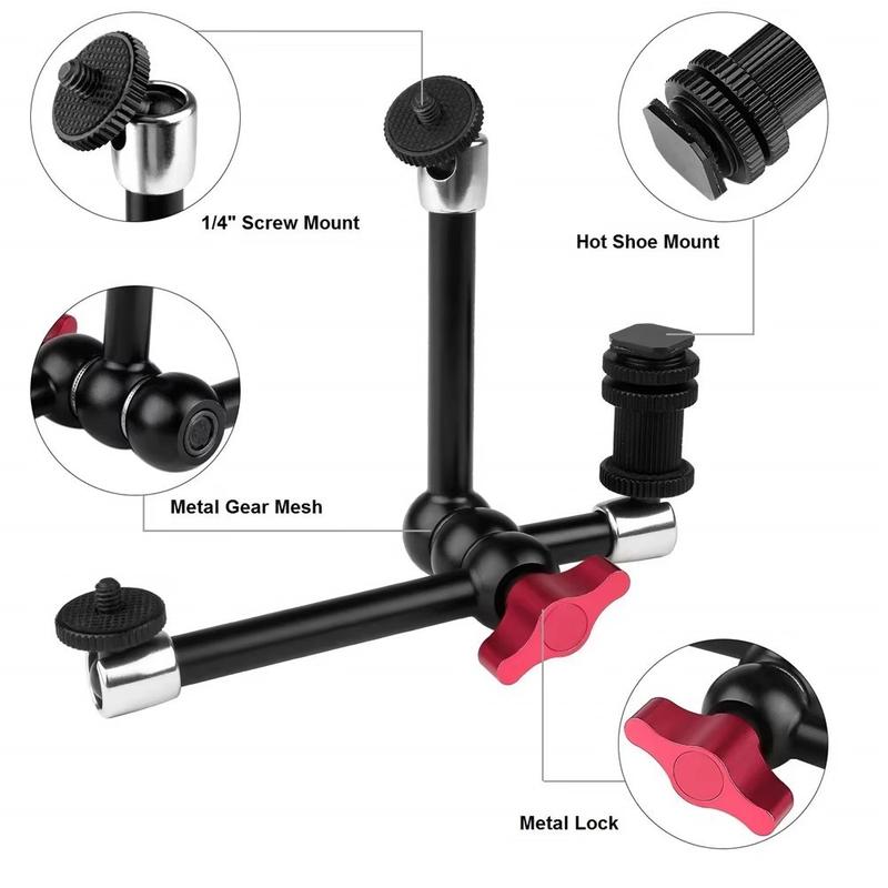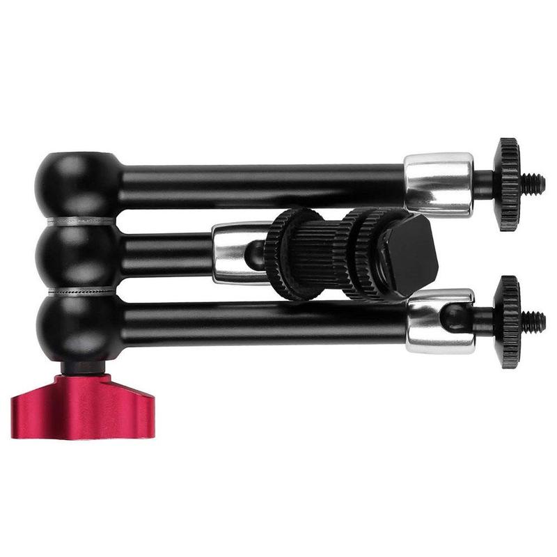 Beslaget er fremstillet af aluminiumslegering og rustfrit stål og har en stærk og holdbar konstruktion med et metalgear-design, der sikrer en mere sikker placering. 360-graders justering på alle samlinger gør det nemmere at finjustere vinklerne, mens hot shoe- og 1/4"-monteringsstøtten giver bred kompatibilitet med DSLR-kameraer og tilhørende tilbehør. Røde quick-lock-håndtag muliggør hurtig opsætning og omplacering uden værktøj, hvilket hjælper med at strømline dit workflow under optagelse.