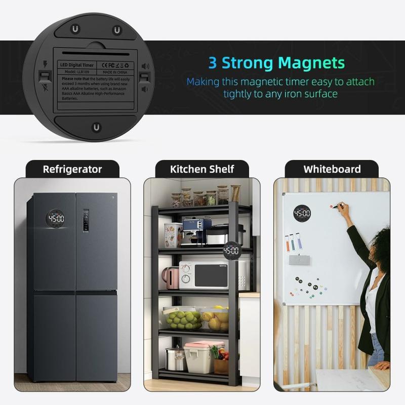 - Magnetisk bagside med høj styrke og udfoldelig stander giver fleksible monteringsmuligheder, uanset hvor der er brug for tidtagning