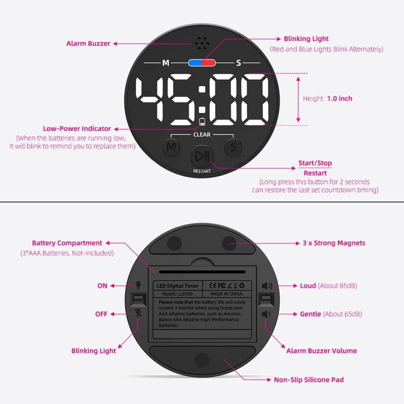 En lille enhed erstatter telefonapps, der dræner batterier og samler mel, og giver dig taktil kontrol, højere alarmer og øjeblikkelig læsbarhed fra den anden side af lokalet. Den magnetiske pude holder bordpladen fri, mens AAA-strømforsyningen og den robuste ABS-skal betyder mange års pålidelig service - det sparer både tid og penge i forhold til billige engangs-timere.