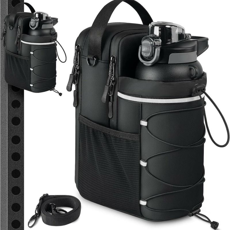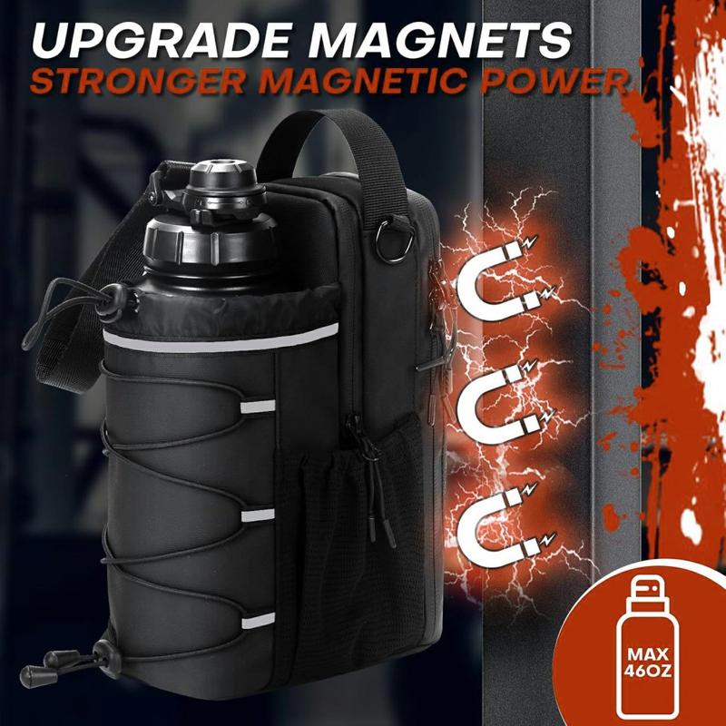 Håndfri hydrering møder elegant urban stil: Denne vandtætte slynge i PU-polyester har kraftige magneter, der låser en 1,9 L / 3 kg flaske fast til træningsudstyr i metal - eller dit køleskab - mens lynlåslommer holder telefon, nøgler og kort rene.
