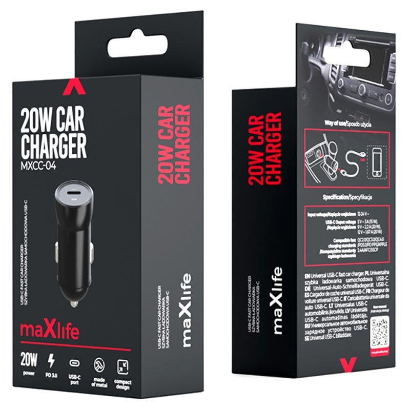 Maxlife MXCC-04 USB-C Hurtig Biloplader - 20W, PD3.0, QC3.0, Apple 2.4A, Samsung AFC