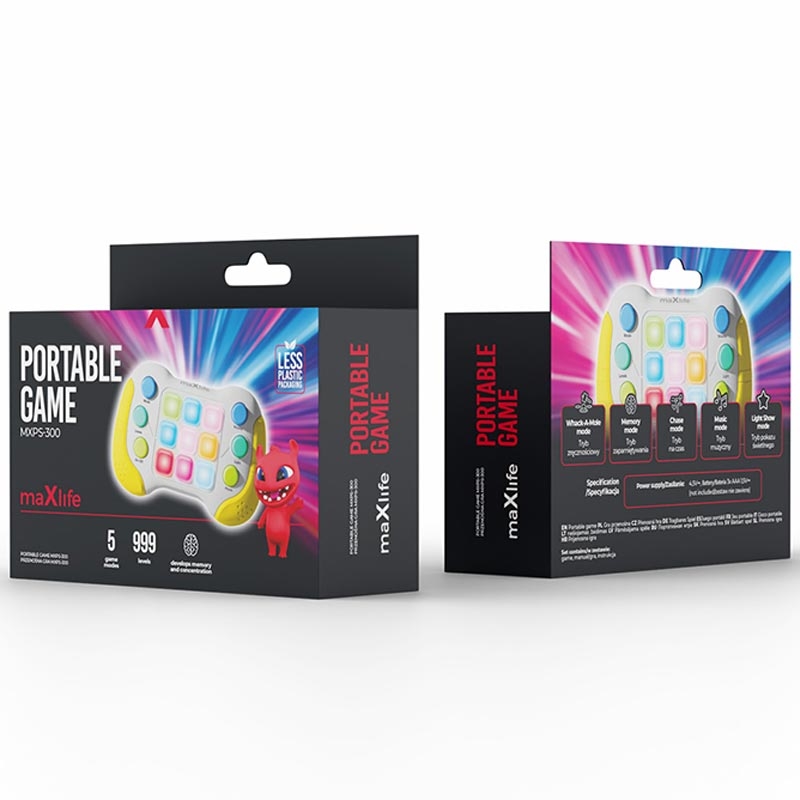 Maxlife MXPS-300 Electronic Push Game giver et moderne twist til det klassiske taktile legetøj. Det er designet til sjov, fokus og koordination og hjælper spillere i alle aldre med at udvikle reflekser, hukommelse og hånd-øje-koordination gennem dynamiske lys- og lydbaserede udfordringer. Det er kompakt og bærbart og passer perfekt i din hånd - klar til at spille hvor som helst og når som helst.
